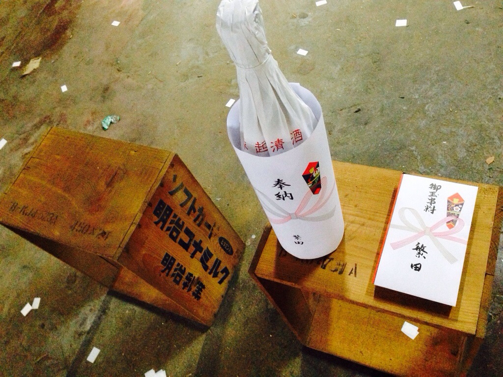 明治コナミルクの木箱に清酒や玉串など、いかにもウチらしい(笑)