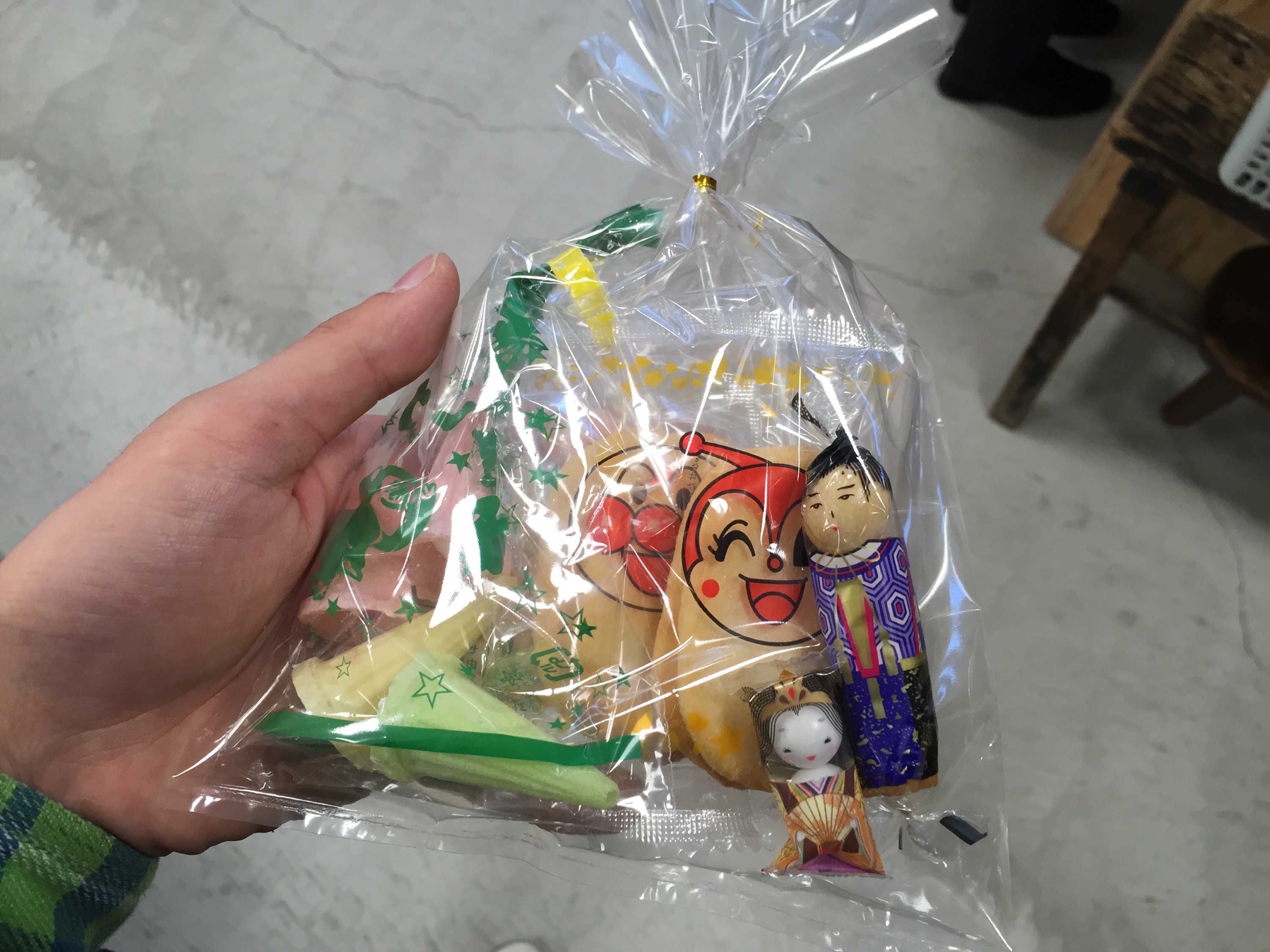 ひなあられ、アンパンマン煎餅×2、ひなこけしあられ、ひなあられチョコボール、ソフト菓子の計6点。